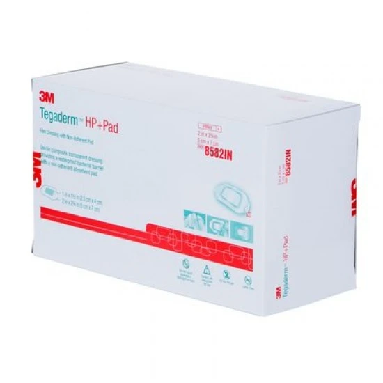 Free Shipping on orders above ₹599 Product Description :3M Tegaderm HP+Pad Film Dressing (8582IN), a sterile composite transparent dressing providing a breathable, waterproof, bacterial and viral barrier with a non-adherent absorbent pad thus protecting against infections and is easy to maintain. In simple words, 3m tegaderm 8582in film dressing is a sterile surgical dressing with a central absorbent and non-adherent pad that helps in moist wound healing and painless dressing removal.3M Tegaderm HP+Pad Film Dressing (8582IN) is breathable, allowing good oxygen and moisture vapor exchange. It is waterproof and impermeable to liquids, bacteria, and viruses. *An intact dressing protects the site from outside contamination. *In Vitro testing shows that the film of Tegaderm and Tegaderm HP dressing provides a viral barrier from viruses 27nm in diameter or larger while the dressing remains intact without leakage.3M™ Tegaderm™ Transparent Film Dressings can be used to cover and protect catheter sites and wounds, to maintain a moist environment for wound healing, and to secure devices to the skin. Tegaderm™ Transparent Film Dressings are made with a thin, semi-permeable film that enables long wear time and full site visibility to minimize unnecessary dressing changes.Suggested Applications : |