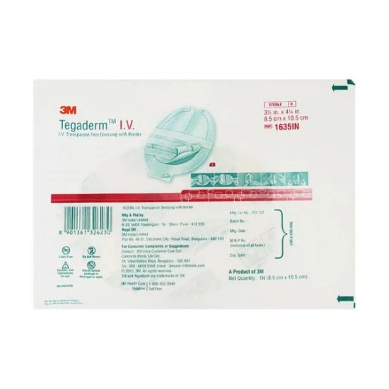 Free Shipping on orders above ₹599 Product Description :3M Tegaderm I.V. Transparent Film Dressing with Border (1635IN) are reinforced with a soft fabric border designed to minimize catheter movement. 3M Tegaderm I.V. Transparent Film Dressing (1635IN) includes a hypoallergenic adhesive, that is not made with natural rubber latex, that enables long wear time and full site visibility to minimize unnecessary dressing changes. Size of each tegaderm (1635IN) dressing is 3-1/2 inch x 4-1/4 inch (8.5 cm x 10.5 cm). 3M Tegaderm (1635IN) Transparent Film Dressing with Border is breathable, allowing good oxygen and moisture vapor exchange. It is waterproof and impermeable to liquids, bacteria, and viruses. *An intact dressing protects the site from outside contamination. Designed for I.V. applications, the dressing is notched and reinforced with soft cloth tape to provide a better seal and reduced edge lift around catheters and other devices.3M™ Tegaderm™ Transparent Film Dressings can be used to cover and protect catheter sites and wounds, to maintain a moist environment for wound healing, and to secure devices to the skin. Tegaderm™ Transparent Film Dressings are made with a thin, semi-permeable film that enables long wear time and full site visibility to minimize unnecessary dressing changes.Suggested Applications : |