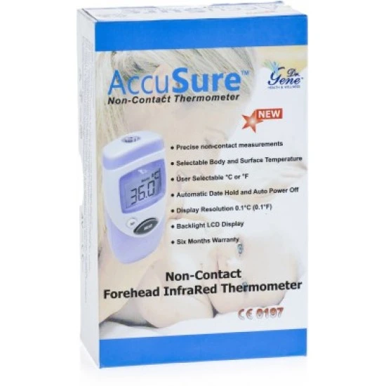 Accusure (Dr.Gene) Non Contact Thermometer with selectable body and surface temperature feature. 100% mercury free, Being non contact no chances of any infection.With User selectable C or F, Automatic date hold and auto power off, backlight LCD display etc. Ideal for all age groups for precise non contact measurement.