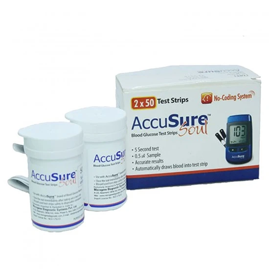 Free Shipping on orders above ₹599 Product Description : Dr. Gene AccuSure SOUL Blood Glucose Test Strips (Pack of 100) are used only with the AccuSure Soul Glucometer for quantitatively measuring glucose in whole blood. The AccuSure Soul test strips are no coding test strips as it does not require any type of manual coding. You will get accurate results within 5 seconds after applying only 0.5 micro liters blood sample on AccuSure Soul Test Strip. The pack contains 100 strips (2x50 pack).AccuSure Soul Glucometer Test Strips are intended for use outside the body (in vitro diagnostic use) for self-testing use as an aid in the management of diabetes. |