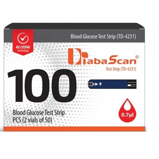 Free Shipping on orders above ₹599 Product Description : DiabaScan Blood Glucose Test Strips (100 Strips - 2x50 Pack) are used only with DiabaScan PRO (TD-4235) & DiabaScan (TD-4231) Glucometers to measure blood glucose levels in whole blood for self testing at home or healthcare professional use. For this, it uses fresh whole blood samples from the finger, palm, upper arm and forearm. DiabaScan Test Strips requires tiny blood sample (i.e. just 0.7uL blood) to perform the glucose test and quick results are shown on DiabaScan glucometer within 7 seconds. Note :-