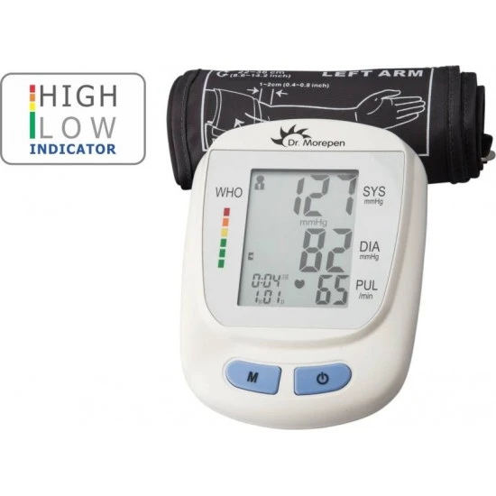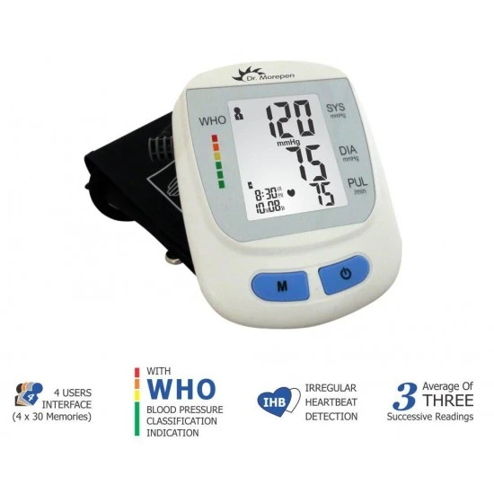 Free Shipping on orders above ₹599 Product Description :Dr. Morepen BP 09 Automatic Blood Pressure Monitor is intended for non invasive measuring of an adult individual systolic, diastolic, blood pressure and heart rate using the oscillometric method. The device is designed for home or clinical use. All values can be read out in one LCD display. The measurement position is on adult upper arm only |