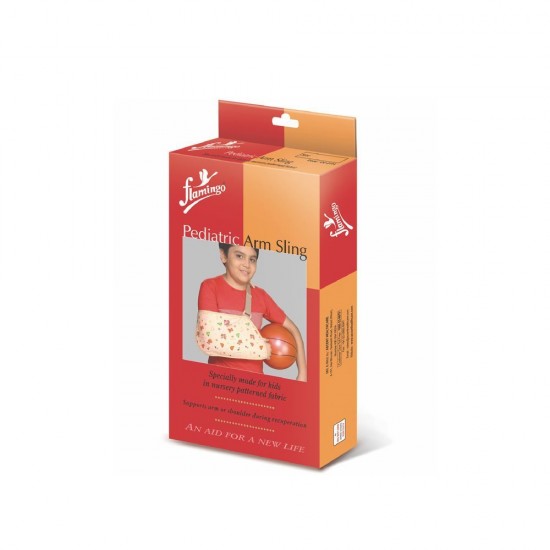 Flamingo Pediatric Arm Pouch Sling is specially made for kids in nursery patterned fabric. Support arm or shoulder in case of closed or surgical management of strain, sprain, fractures and dislocation. An adjustable, broad shoulder pad reduces pressure on neck and shoulder. Thumb loop inside the fabric for resting the hand when desired.