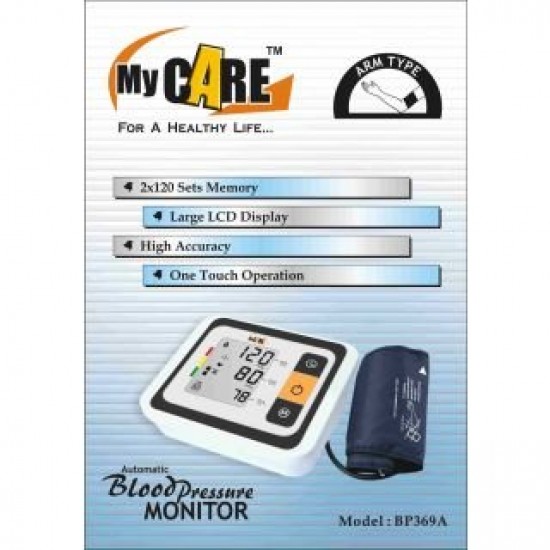 Product Description : MyCare Digital Upper Arm Type B.P 369A To keep track of your blood pressure and help you in effective health management, here is the My Care BP - 369A Blood Pressure Monitor with a digital display. It is a convenient thing to be used by people with blood pressure or in clinical settings by healthcare professionals. It is a highly accurate device and features body movement detection that sets it apart from other blood monitors. Sporting a big screen that displays the pulse/min, this digital monitor has high functionality and easy operation. Its highlights include a hypertension detection mechanism that aids people with high blood pressure. The precision of its output is endorsed by its digital numerals that display the 240 readings as well. It is operated through a battery which ensures it long lasting performance and easy maintenance. The My Care Bp - 369A Blood Pressure Monitor has an affordable price and awesome features such as irregular heart beat detection that makes it a super utility device. |