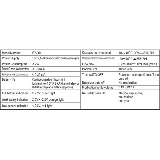 Particle Size : MMAD 4.98um, Sound : Less than 30db, Aerosol Output : 0.2ml/min