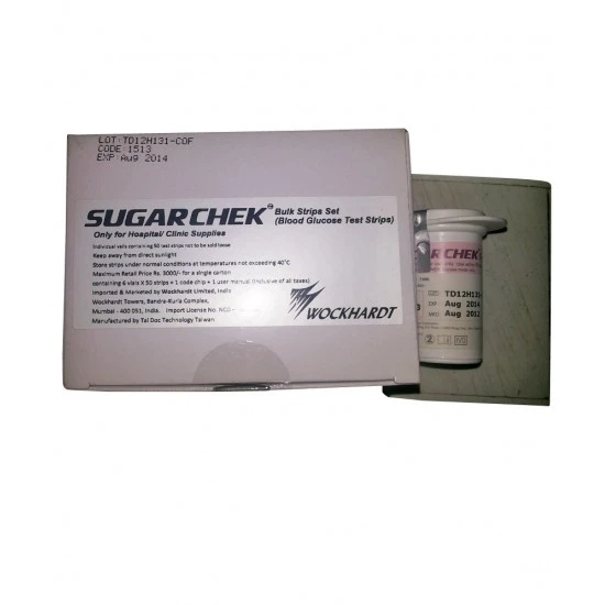SUGARCHEK TEST STRIPS for blood glucose used with Sugarcheck Glucometer. It is a bulk pack containing 6 vials X 50 Strips + 1 code chip + 1 User manual.