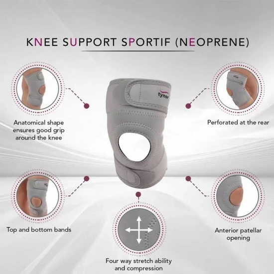 Knee Support Sportif (Neoprene) is a designer support to provide firm compression, mild support and warmth to the knee joint, to allay pain and inflammation, generally associated with old age, arthritis. It is widely used during sports and for sports related injuries.