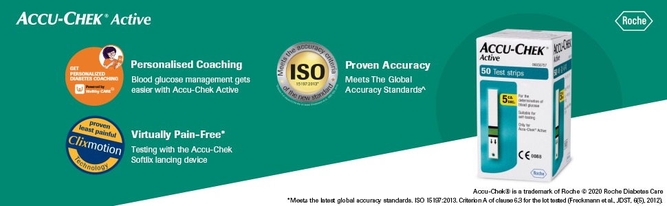 Product Description : Testing your blood glucose has an integral role in managing diabetes. Accu-Chek Active Test Strips 50's when used along with the Accu-Chek Active blood glucose meter can aid to make it convenient by giving you quick, hassle-free, and reliable results in easy steps... Accu-Chek Active Test Strips 50's Pack are made to used only with Accu-Chek Active Blood Glucose Monitoring System which fulfils ISO 15197:2013 standards of accuracy. Accu-Chek Active 50 Test Strips are mainly used for quantitatively measuring blood glucose in fresh capillary by blood reflectance photometry technology. Accu-Chek Active Test Strips 50's are ideal for both self-testing and professional use. People with diabetes can use these glucose strips along with the system to self-test their blood glucose. Healthcare professionals can use these strips to check patients' blood glucose values and they can use it in suspected cases of diabetes and in emergency diagnostics. Accu-Chek Active Test Strips 50's facilitates easy and simple usage as it does not need any type of manual coding. Accu-Chek meter requires 1-2 μl of blood volume on a glucose test strip. Accu-Chek Active Test Strips has a clever functionality feature also which helps the blood to get automatically absorbed by the glucose strip and allows to spreads instantly across it. After that accurate results are shown just in approximately 5 seconds if test strip is in the meter, when you apply blood. Otherwise, if you remove the test strip from the meter and then apply blood, the test takes approximately 8 seconds. For the determination of blood glucose, it is simple to use. All you need to do is to remove a single diabetes test strip from the box of strips. Then insert it into the slot on the glucometer just before you prick your finger and put blood sample on the test strip. By this way it will be easy to complete the test and get quick and reliable results. In case of any confusion, read the instructions on the glucometer beforehand. Accu-Chek Active Strips are also available in packs of 10, 25 and 100 strips.Checking the test result using the test strip control window: The test strip itself allows you to estimate the test result through colour comparison and thus check the displayed test result in addition Only the test results displayed by the meter should be used for therapy recommendations. The colour comparison serves only as a plausibility check of the test result.Some Features of Accu-Chek Active :