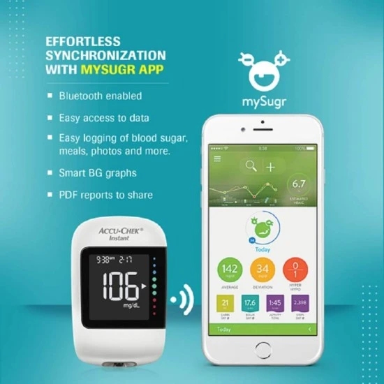 Once connected with mySugr management app, the meter automatically logs your blood glucose results and wirelessly transfers them to your smartphone. All data can be uploaded to the mySugr by using Bluetooth Low Energy wireless technology and to Accu-Chek Connect Online portal by using USB