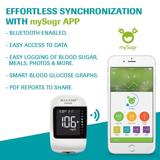 Once connected with mySugr management app, the meter automatically logs your blood glucose results and wirelessly transfers them to your smartphone. All data can be uploaded to the mySugr by using Bluetooth Low Energy wireless technology and to Accu-Chek Connect Online portal by using USB