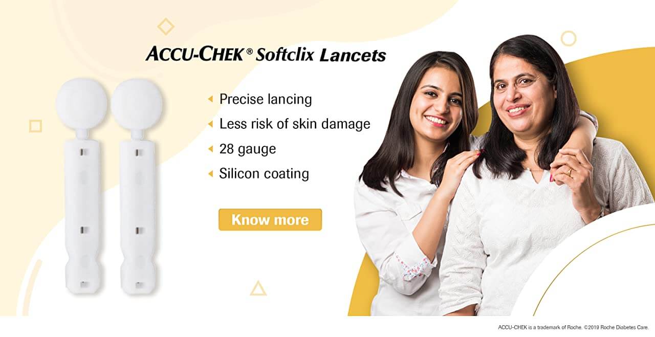 Product Description :Accu‑Chek Softclix 25 Lancets are silicone coated lancets, used only with the Accu‑Chek Softclix, Softclix Plus or Softclix Classic Lancing Device to obtain a drop of blood from the fingertip for blood glucose levels/ sugar testing. Clixmotion technology controls the Accu-Chek Softclix lancet’s movement and provides virtually pain-free lancing. Less side-to-side motion of the lancet means less skin damage. Furthermore, The Accu-Chek Softclix lancets are precisely manufactured for precise entry. Diameter of Accu-Chek Softclix Lancet Needle is 0.4 mm and its Gauge is 28.Accu‑Chek Softclix Lancets are sterile and highly appreciated by the patients/ users because to its painless nature.Directions For Use :