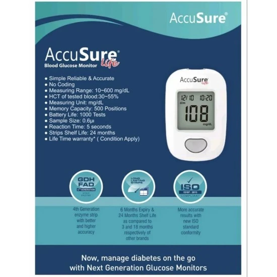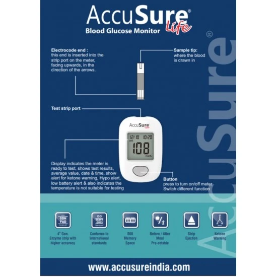 • Ketone Warning : Complications of this disease are widespread, and the presence of ketone bodies in the blood is one of them. In order to achieve that extra level of safety, the accusure life blood glucose monitor comes with a system that can warn about rising ketone levels in the blood when the test result is equal to or above 300 mg/dL