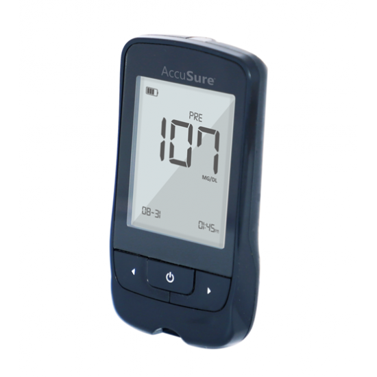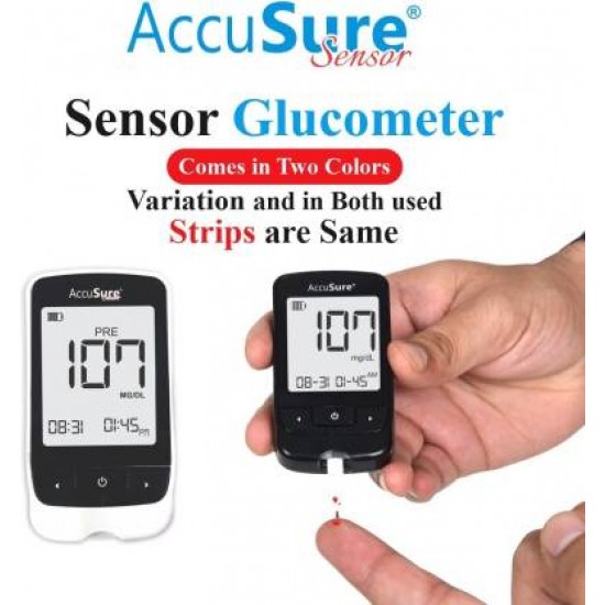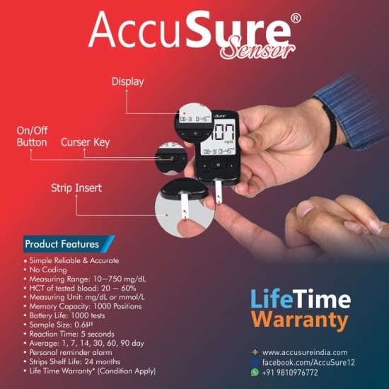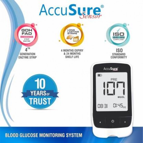 Product Description : AccuSure Sensor Blood Glucose Monitoring System With 50 Test Strips is based on GDH-FAD 4th generation enzyme strip technology to provide the most accurate results. This glucose monitor is mainly used to quantitatively measure glucose in whole blood. It requires tiny blood sample i.e. just 0.6uL blood to complete the glucose test and quick results are shown within 5 seconds. The system also fulfills ISO standard conformity as it is made in accordance with ISO 15197:2015.AccuSure Sensor Blood Glucose Monitor boasts Autocode capabilities, requiring completely no cryptography for attention professionals and patients. What this implies is fewer steps throughout the testing method and no risk of false readings due to errors associated with incorrect coding. It is easy to use whereas providing safe, accurate, reliable and rapid results every time. AccuSure renders results in just 7 seconds, signifying the most rapid testing procedure attainable. With testing this fast and simple, you’ll expect the least interference together with your daily routine and also the ability to induce back to doing the things you like to do! And AccuSure comes with a lifetime warranty for complete peace of mind.AccuSure Sensor Glucometer is ideal for people with diabetes for self-testing. Moreover, Healthcare professionals can use the system to check patient's blood glucose values in suspected cases of diabetes and in emergency diagnostics also.ACCUSURE SENSOR BLOOD GLUCOSE MONITORING SYSTEM - INDICATIONS FOR USE :The AccuSure Blood Glucose Monitoring System is intended for the quantitative measurement of glucose in whole blood. It is intended for use by people with diabetes mellitus at home as an aid in monitoring the effectiveness of diabetes control program. It is not intended for the diagnosis of or screening for diabetes mellitus, and is not intended for use on neonates. Venous blood testing is limited to healthcare professional use only.TEST PRINCIPLE :The measurement is based on amperometric technology. When the blood sample or control solution is drawn into the reaction zone, glucose in the sample reacts with glucose dehydrogenase and produces an electrical current. Your meter measures the electronic current and converts it into your blood glucose result. The results provided will be whole blood equivalent.Key Features:
