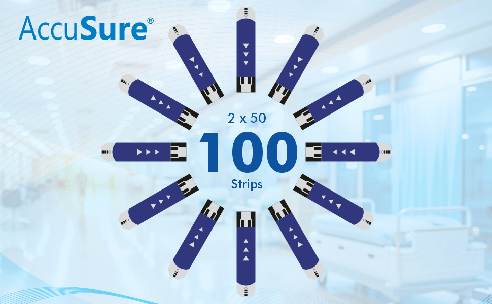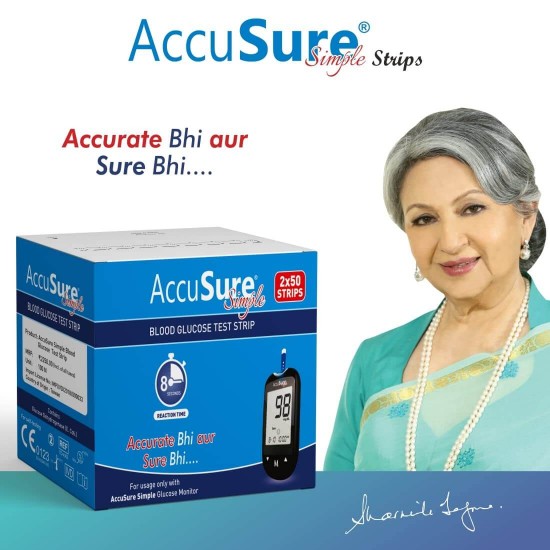 Free Shipping on orders above ₹599 Product Description :AccuSure Simple Blood Glucose Test Strips 100's pack (2x50) are used only with AccuSure Simple Glucometer to measure blood glucose levels in whole blood for self testing at home or professional use. For this, it uses fresh capillary whole blood samples from the finger, palm, upper arm and forearm, as well as from venous whole blood.Professionals may use test strips to test capillary and venous blood sample; home use is limited to capillary whole blood blood testing. |