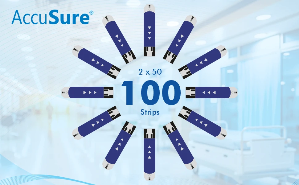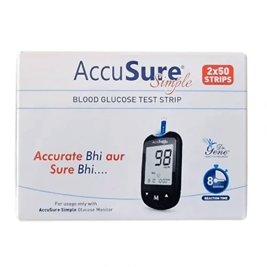 Free Shipping on orders above ₹599 Product Description :AccuSure Simple Blood Glucose Test Strips 100's pack (2x50) are used only with AccuSure Simple Glucometer to measure blood glucose levels in whole blood for self testing at home or professional use. For this, it uses fresh capillary whole blood samples from the finger, palm, upper arm and forearm, as well as from venous whole blood.Professionals may use test strips to test capillary and venous blood sample; home use is limited to capillary whole blood blood testing. |
