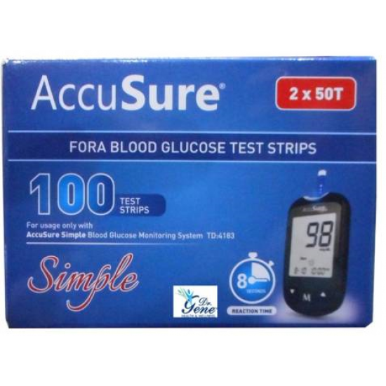Dr. Gene AccuSure Simple Test Strips (Microgene) - 100 strips pack comes with two vials contains 50 strips each. It is compatible with Accusure Simple Glucometer only and gives accurate results in 8 seconds.