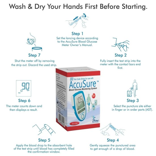 Free Shipping on orders above ₹599 Product Description :Dr. Gene AccuSure Fora Blood Glucose Test Strips also known as AccuSure Blue Glucometer Strips are used only with AccuSure Blood Glucose Meter (Blue in color) to quantitatively measure blood glucose levels in whole blood for self testing or professional use. For this, it uses fresh capillary whole blood samples from the finger and the following alternative sites (AST): the palm, the upper arm and the forearm. The AccuSure Blue Test Strips are no coding test strips as it does not require any type of manual coding. You will get accurate results within 7 seconds after applying only 0.7 micro liters blood sample on AccuSure Test Strip. Auto Code Technology : Dr. Gene AccuSure boasts Autocode capabilities, requiring no coding for healthcare professionals and patients. What this means is fewer steps during the testing process, and no risk of false readings because of errors related to incorrect coding. AccuSure Glucometer Test Strips are intended for use outside the body (in vitro diagnostic use) for self-testing and health care professional use, as an aid in the management of diabetes. |