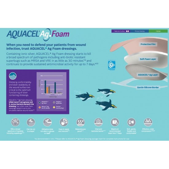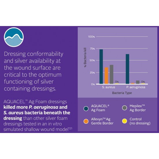 Containing ionic silver, Aquacel Ag Foam Dressing starts to kill a broad spectrum of pathogens including anti-biotic resistant superbugs such as MRSA and VRE in as little as 30 minutes and continues to provide sustained antimicrobial activity for up to 7 days.