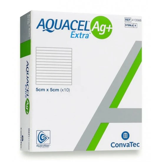Free Shipping on orders above ₹599 Convatec Aquacel Ag Plus Extra Dressing (5cm x 5cm), Ref #413566 from ConvaTec is an antimicrobial sterile wound dressing, combining the specifically developed MORE THAN SILVER Technology (Ag+) with the unique capabilities of Hydrofiber Technology to manage the 3 key local barriers to wound healing - exudate, infection and biofilm.