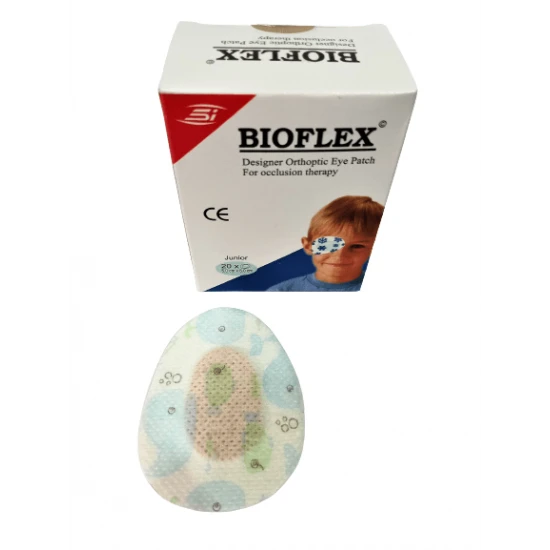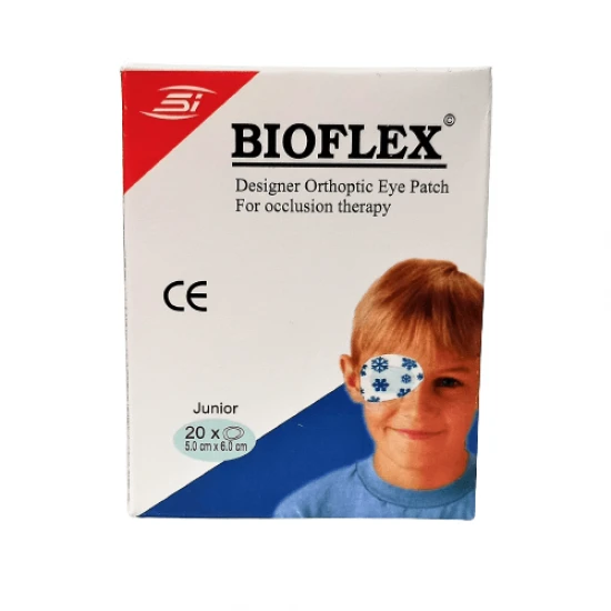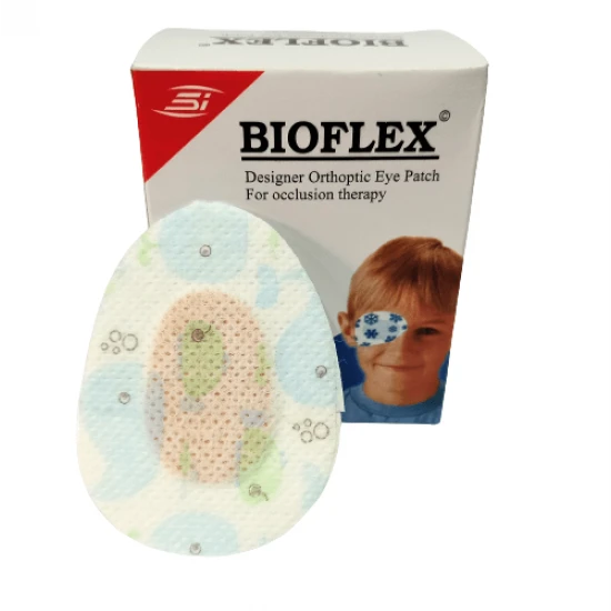 Free Shipping on orders above ₹599 Product Description :Made with a hypoallergenic adhesive, the Bioflex Designer Orthoptic Eye Patch Junior for occlusion therapy is exceedingly gentle and forms a breathable, absorbent layer of soft, non-stick material. Each pad fits comfortably behind glasses and easily permits eyelid movement during wear. Bioflex Designer Orthoptic Eye Patch for kids is 5.0cm x 6.0cm in size.Bioflex Designer Orthoptic Eye Patch is a convenient eye patch that can be used for treating childhood strabismus (lazy eye syndrome), amblyopia as well as for squint correction. Worn over the preferred eye, the Bioflex eye patch encourages the weaker eye to function.