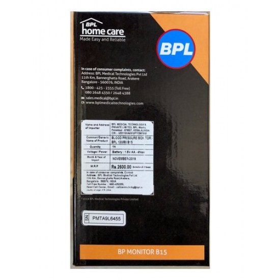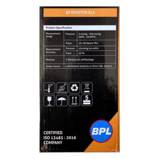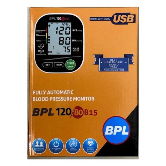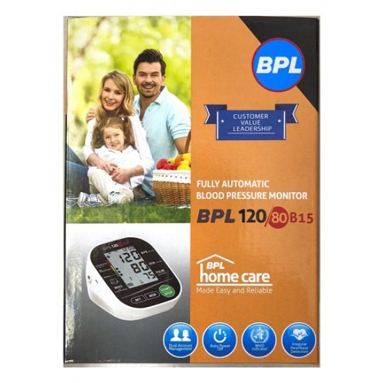 Product Description :BPL 120/80 B15 fully automatic blood pressure monitor can measure the upper and lower pressure value simultaneously by fuzzy logic control. Personalized inflation leads to the result of value every time. It is effective to reduce the discomfort by wrongly inflating the arm cuff and also to reduce the wrong measurement value, thus, it improves the accuracy of the measurement. BPL 120/80 B15 automatic blood pressure monitor can store up to 99 sets of measurement value for two users in memory. Meanwhile, it can display the latest 3 sets of average measurement value. Intended Use : This device is intended for non-invasive measuring of an adult individual's systolic, diastolic blood pressure and heart rate using the oscillometric method. The device is not intended for use on infants and children. The device is designed for home or clinical use. Features & Specifications :