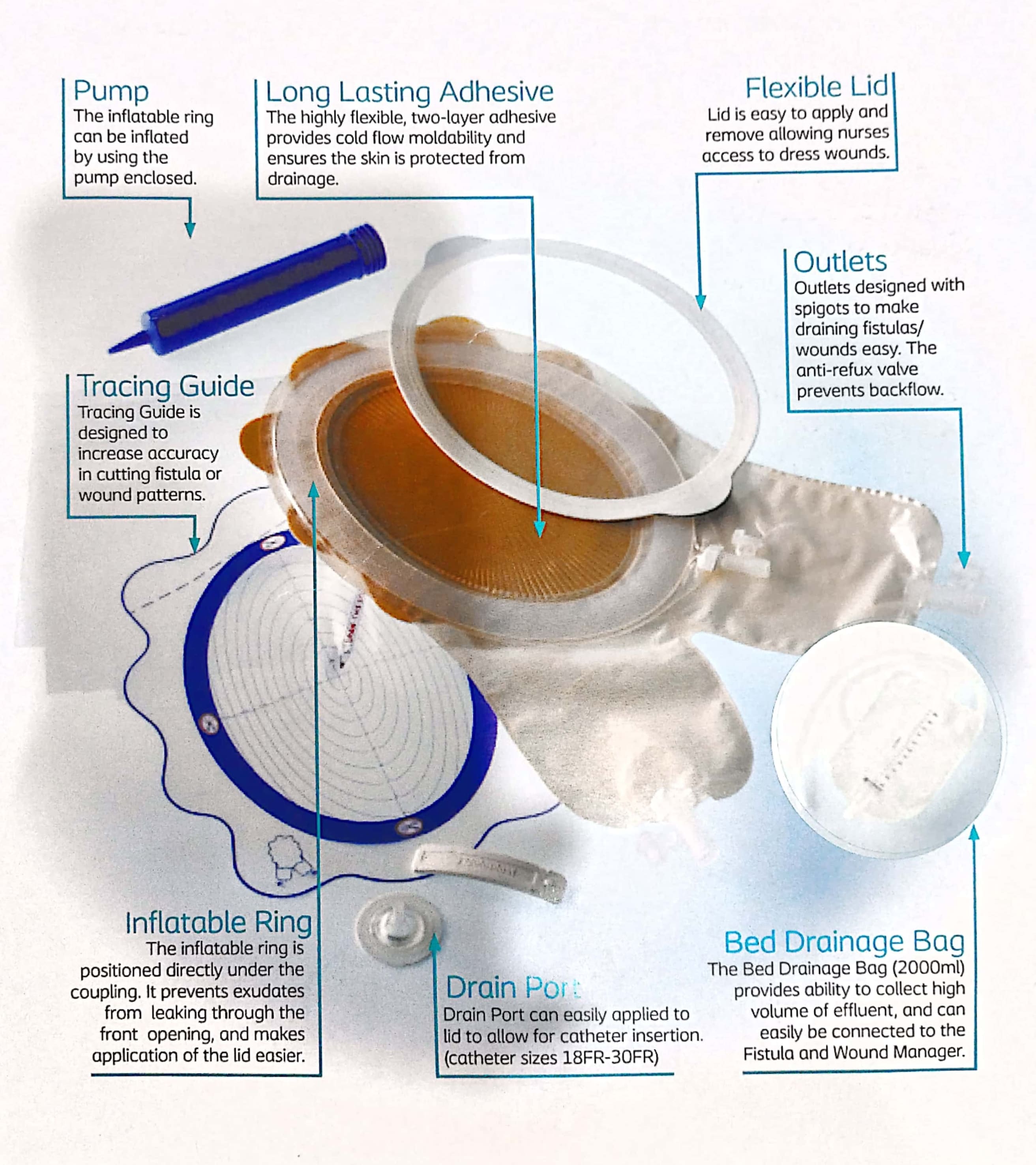 Product Description : The Coloplast 14050 Fistula and Wound Management System Mini size with cutting surface of 104-159 mm (4" - 6 1/4") is a specialized medical device designed for effective wound and abdominal fistula management. Patients living with a fistula may be isolated at home or in a healthcare setting, and their movement may be significantly restricted. The Coloplast Fistula and Wound Management System helps them learn to live with and tend to their condition.Coloplast 14050 Fistula and Wound Manager provides healthcare professionals with a reliable solution for managing complex wound and fistula cases, ensuring optimal patient comfort and recovery.The Coloplast Fistula and Wound Management System is designed with a flexible adhesive. The pouch conforms to unique abdominal contours and molds to the skin with ease. The two-layer adhesive provides cold flow moldability and ensures the skin is protected from drainage. The Coloplast Fistula and Wound Management System was designed together with nurses to be a simple solution which can manage the fistula, providing patients with a comfortable pouch while saving nurses time.The solution includes a long-lasting adhesive barrier and pouch, tracing guide, removable lid, drain port, and a clamp● Double-layer adhesive - flexible and long-lasting, and protects the skin from drainage.● Tracing guide - designed to increase accuracy in cutting fistula or wound pattern.● Removable lid - flexible and easy to apply and remove, allowing nurses access to dress wounds.Prior to use, refer to the product ‘Instructions for Use’ for intended use and relevant safety information.Features & Specifications :