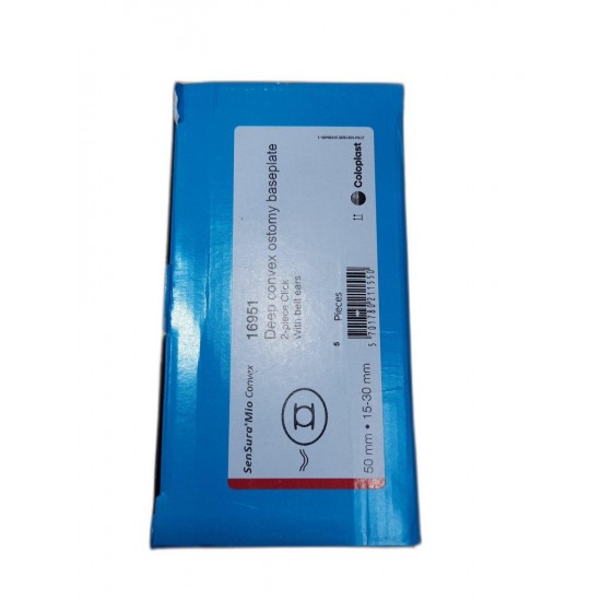 Product Description : Coloplast 16951 50mm SenSura Mio Deep Convex Base Plate (Barrier) is one among the sensura mio 2-piece convex baseplate category of Coloplast.SenSura Mio is a new range of ostomy products that suit individual body shapes thanks to the elastic adhesive, and the bag remains discreet due to the neutral grey color of the fabric.SenSura Mio fits individual body shapes and follows the body's natural movements, so that a secure adhesion is maintained. The elasticity of the adhesive may stretch and retract. Skin has a natural elasticity which helps it to bend and stretch as the body moves. SenSura Mio is elastic just like the skin, so it bends and stretches with the skin when you move the body.With SenSura Mio you will feel safe, so you can feel safe in everyday life, even in a social situation.Coloplast Sensura Mio 16951 Deep Convex Base Plate is an adaptable convex bowl that ensures stability around the stoma and is flexible at the same time. The elastic adhesive fits your body shape and the bag remains discreet due to the gray color of the fabric.Coloplast 16951 SenSura® Mio Deep Convex Baseplate has a curved shape that fits securely to uneven skin areas, deep-seated areas and stomas that need support or help to protrude. Combined with the elastic adhesive, it provides a secure adhesion* to individual body shapes.Coloplast SenSura® Mio 16951 50mm Deep Convex 2-piece Baseplate is a standard wear type skin barrier and has a "cut-to-fit" opening that means it can be cut to achieve a custom fit. This mio convex ostomy base plate is commonly used for 15-30 mm stoma size. It has double belt tab for coupling.The SenSura Mio Convex 2-piece Click baseplate featuring an adaptive convex shell and an elastic adhesive is separate from the bag, so the bag can be changed without changing the baseplate. The bag is coupled to the baseplate by means of the Click coupling, which gives an audible “click” when the pouch is securely locked to the baseplate. SenSura Mio Convex Click is available in a broad range of baseplates: Light and Deep convex variants in various pre-cut or hole sizes which can be customized, with pouches in a variety of sizes available in transparent, or with inspection window, and with coupling systems of 50, 60 or 70 mm in diameter.The Light convex is for stomas with openings in level with the skin that need gentle help to protrude, or for slightly deep-seated areas where a light curve is needed to get a good grip.No two bodies are alike. Real people have real bodies that come in different sizes and shapes, and the shapes change during the day as we move. That is why it is a challenge to find a stoma product that fits.