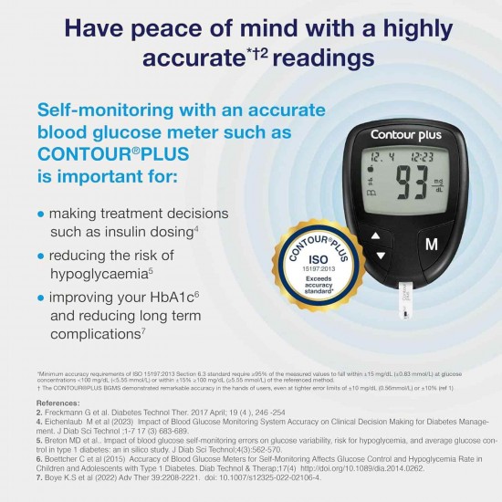 • Dependable Results in 5 Seconds: Accuracy is priority when it comes to self-testing. Many treatment factors are based on the individual's test results. With the Contour Plus Meter, stay peaceful because it is highly accurate and meets the EN ISO 15197:2015 standards.