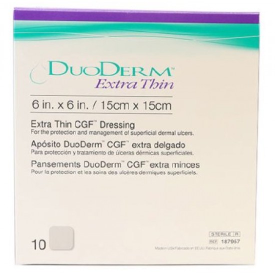 Product Description :ConvaTec DuoDERM Extra Thin CGF Dressing (6 x 6 Inches) - 10 Pcs Box Ref # 187957 is mainly helpful for the protection and management of superficial dermal ulcers. DuoDERM Extra Thin dressings from ConvaTec are highly flexible, control gel formula dressings designed for use on dry to lightly exudating wounds. DuoDERM Extra Thin dressings are particularly suitable in areas subject to friction and those requiring contouring, e.g., elbows, heels. DuoDERM Extra Thin dressings interact with wound moisture producing a soft mass that enables removal of the dressing with little or no damage to newly formed tissues. They help isolate the wound against bacterial and other external contamination. DuoDERM® CGF™ Dressing is an adherent dressing indicated for the management of exuding wounds. Indications :• Management of superficial, dry to lightly exudating dermal ulcers. |