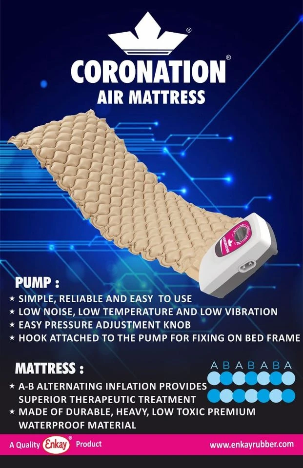 Coronation Air Mattress With Adjustable Pump (Medical Anti-Decubitus System), also known as hospital bed or air bed is very effective in treatment and prevention of bed sores arising due to bed-ridden condition of the patient. This Coronation air mattress is made of Durable heavy, Low Toxic premium Waterproof Material and its A-B Alternating inflation provides superior therapeutic treatment. The Adjustable Pump of this air mattress features Simple, Reliable and easy to use, Low Noise, Low Temperature and Low Vibration, Easy Pressure adjustment Knob, Hook attached to the pump for fixing on bed frame and many more. This air mattress provides most of the comfort to the patient as it is developed after a long research and development.