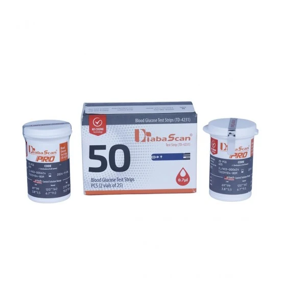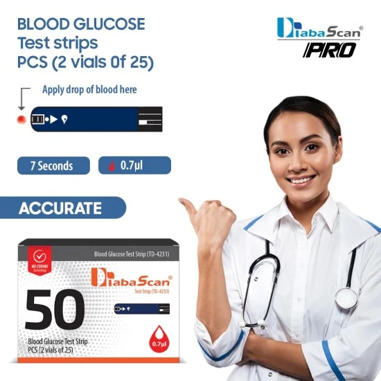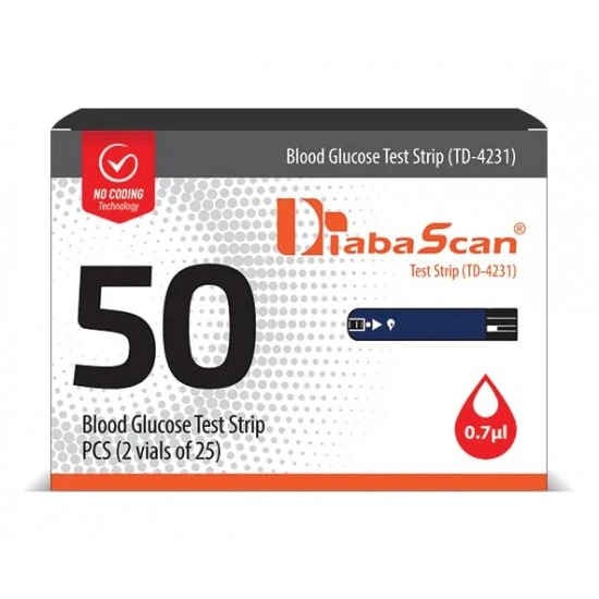 Free Shipping on orders above ₹599 Product Description : DiabaScan Blood Glucose Test Strips (50 Strips - 2x25 Pack) are used only with DiabaScan PRO (TD-4235) & DiabaScan (TD-4231) Glucometers to measure blood glucose levels in whole blood for self testing at home or healthcare professional use. For this, it uses fresh whole blood samples from the finger, palm, upper arm and forearm. DiabaScan Test Strips requires tiny blood sample (i.e. just 0.7uL blood) to perform the glucose test and quick results are shown on DiabaScan glucometer within 7 seconds. Note :-