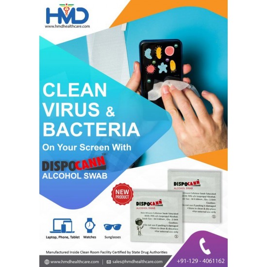 Product Description : HMD Dispocann Alcohol Swabs (Pack of 100 Pieces) are pre-moistened, ready to use, high quality and non-woven cellulose swabs which are saturated with 70% v/v Isopropyl Alcohol. Isopropyl Alcohol 70% by volume for optimum anti-bacterial action. The alcohol helps disinfect the skin and other surfaces of potential sources of infection. These alcohol swabs from dispocann are mainly use as an antiseptic skin cleaner before injection. Size of each swab is 30 X 60 mm. One pack of dispocann alcohol swabs contains 100 units.HMD Dispocann Alcohol Swabs are ideally used for the preparation of the skin prior to an injection, to decrease germs in minor cuts, scrapes and other contamination for preventing illness.HMD Dispocann Alcohol Swabs are manufactured by M/s Mohan Health Care, Gurugram which is a contract supplier for HMDInstructions for useActive ingredient: Saturated with 70% V/v Isopropyl alcoholInactive ingredient: Purified Water