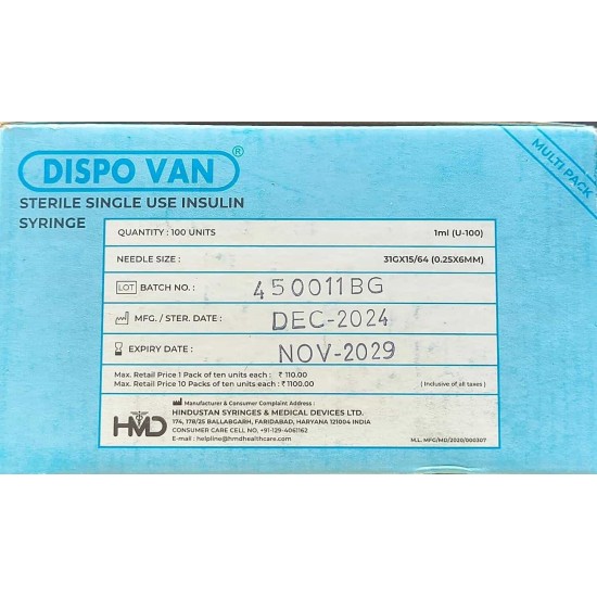 Dispovan One-time Use Insulin Syringes are made in compliance with the highest quality standards. The insulin syringes comes with 31G x 5/16″, ‘Xtra-Fine’ siliconized insulin needles in order to reduce patient pain during injection. Low dead space ensures that the dosage is accurate and there is no wastage of medication. The convenient, easy to handle and patient friendly single-use insulin syringes also minimize the chances of spreading blood borne infections and deadly diseases.