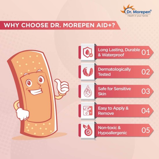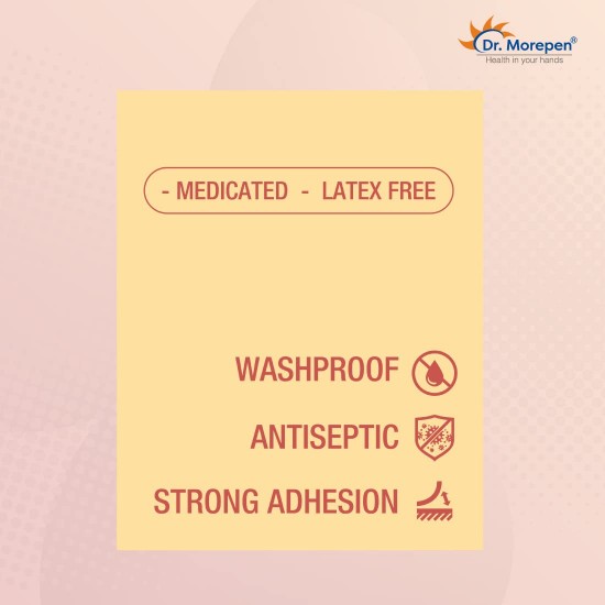 Free Shipping on orders above ₹599 Product Description : Dr. Morepen brings you the trust and credibility of more than 20 years to bring you the best of science with the Aid Adhesive First Aid Dressing.Dr. Morepen AID is an adhesive first aid dressing that comes with wash proof and antiseptic properties for help in healing of cuts as well as wounds while providing water blockage. Additionally, it also saves them from getting infected.With strong adhesion and a medicated & latex free formulation, Dr. Morepen AID adhesive first aid dressing provides the required protection to the wound till it is healed.Why Choose Dr. Morepen AID+ ?