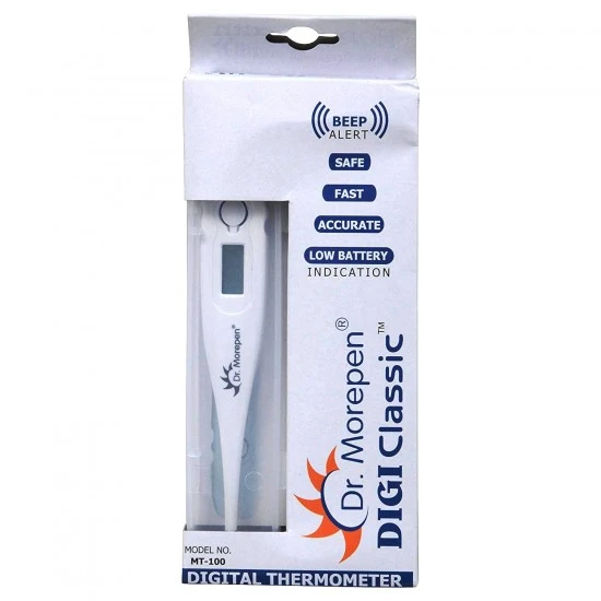 Free Shipping on orders above ₹599 Product Description: Dr. Morepen Digital Thermometer (Digi Classic MT-100) is a small hand-held device which provides a quick and highly accurate reading of an individual's body temperature. This digital thermometer from Dr. Morepen is simple and easy to use & measures your body's temperature just within few couple of seconds. It can be used by both child & adult. Gives appropriate and precise results. Oral, Oxter and Rectal measurement can be done through this digital thermometer. Features & Specifications :