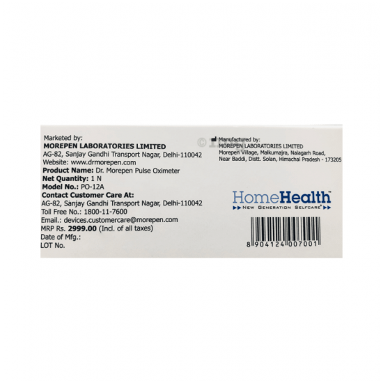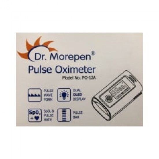 Free Shipping on orders above ₹599 Product Description : General Description: The body's need for oxygen is certain. Its availability at a tissue level is sometimes in doubt. Blood gas measurements provide critical information regarding oxygenation, ventilation, and acid-base status. However, these measurements only provide a snapshot of the patient's condition taken at the time that the blood sample was drawn. It is well known that oxygenation can change very quickly. In the absence of continuous oxygenation monitoring, these changes may go undetected until it is too late. Pulse oximeters measure blood oxygen saturation noninvasively and continuously. Intended Use: The Dr. Morepen Pulse Oximeter (Model PO-12A) is intended for the measurement of blood oxygen saturation levels (SpO2) and pulse rate at the fingertip. It is intended for use outside the body. The device is intended for use by patients and healthcare professionals as an aid in the management of chronic respiratory illnesses/diseases or the management of circulatory system illnesses/diseases. The device is NOT intended for the diagnosis or screening of any respiratory or circulatory system illnesses/diseases. What is SpO2: A blood-oxygen saturation reading indicates the percentage of functional haemoglobin molecules in blood which are saturated with oxygen. The reading may be referred to as SpO2. Readings vary from 0 to 100%. Normal readings in a healthy adult, however, range from 94% to 100% Device Description: The Dr. Morepen Pulse Oximeter (Model PO-12A) is a small and portable device for the measurement of blood-oxygen saturation levels. By simply inserting one finger in the Fingertip photoelectric sensor, the patient can measure his or her blood-oxygen saturation levels. The Dr. Morepen Pulse Oximeter is an innovative medical device which provides non-invasive and continuous measurement of SpO2 and Pulse Rate (PR). Being portable, it is able to measure Spo2 and PR values quickly and conveniently. Features & Specifications :