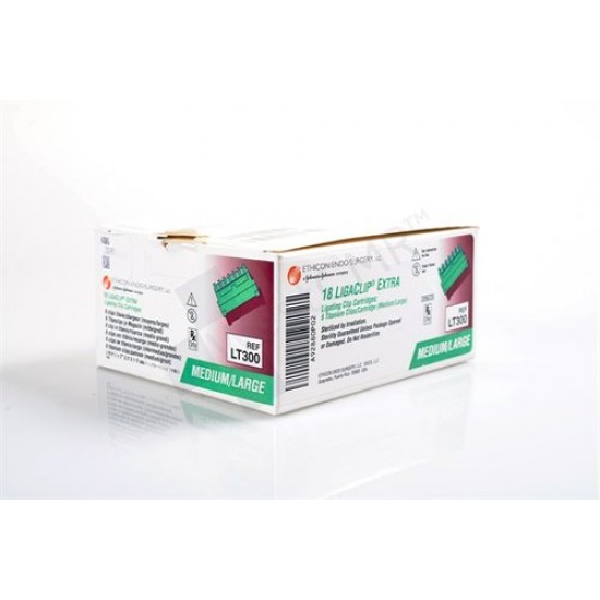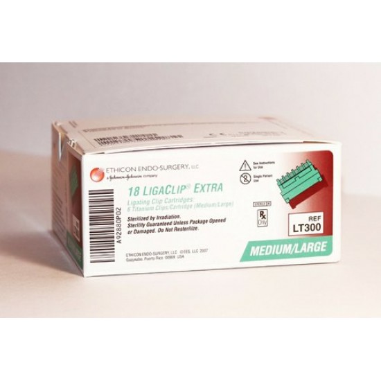 Free Shipping on orders above ₹599 Product Description :LIGACLIP Extra Ligating Clips feature proprietary lateral and transverse grooves designed for secure fixation on the structure and increased resistance to dislodgement of a formed clip. Clips are compatible with both open and endoscopic single clip appliers. LIGACLIP LT300 Extra Ligating Clips (Box of 18) from Ethicon Endo-Surgery, LLC (A Johnson & Johnson Company) are medium/large size clips made for use with open and endoscopic single clip appliers. LIGACLIP LT300 Extra Ligating Clips are sterile, single patient use clips produced from titanium. The clips are designed for the ligation of tubular structures where a nonabsorbable ligating device is indicated. The ligating clips are positioned around a tubular structure and closed by applying pressure to the handles of the applier. One box of Ethicon LIGACLIP LT300 Extra Ligating Clip Cartridge contains 18 units of LIGACLIP LT300 Extra Ligating Clips Cartridges. One unit of LIGACLIP LT300 Extra Ligating Cartridge contains 6 medium/large titanium clips/cartridges. LT300 is for open or endo devices. Clip applier handle color of LIGACLIP LT300 is green. The clips are sterilized by irradiation. Its sterility guaranteed unless package opened or damaged. Do not resterilize. Indications : LIGACLIP Extra Ligating Clips have application for use on tubular structures or vessels wherever metal ligating clips are indicated. The tissue being ligated should be consistent with the size of the clip. About Ethicon's Efficiency and Performance:
