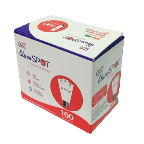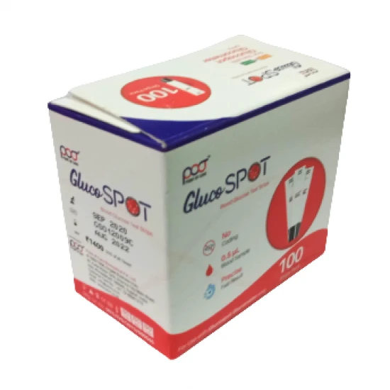 Free Shipping on orders above ₹599 Product Description :POCT Gluco Spot Blood Glucose Test Strips 100's Pack are used only with gluco spot glucometer or gluco spot blood glucose monitoring system. POCT (Point Of Care) gluco spot test strips are mainly used to measure glucose in capillary whole blood outside of the body (In Vitro Diagnostic Use). Glucospot test strips are plasma calibrated to allow easy comparison of results with laboratory methods.Gluco spot blood glucose test strips (100's pack) are suitable for self-monitoring and management of blood glucose. People with diabetes can use these glucose strips along with the system to self-test their blood glucose. Healthcare professionals can also use these strips to check patients' blood glucose values and they can use it in suspected cases of diabetes and in emergency diagnostics. These no coding test strips facilitates simple usage as it does not need any type of manual coding. Gluco spot meter requires 0.5 μl (micro litre) of blood sample on a gluco spot test strip for determining the blood glucose level. Test completes in approx 5 seconds thus provides precise and fast results.Test Principle : When blood is added to the gluco spot strip, the chemicals within the strip react to create a tiny electrical current. Your meter reads the current & displays your level of blood glucose.Gluco spot strips are also available in packs of 25 and 50 strips.ABOUT POCT (POINT OF CARE) :POCT (Point of Care Biomedical Pvt Ltd), Ahmedabad, Gujarat (India) is an ideal example of Quality, Reliability, Integrity & Innovation.POCT is the sister concern of PROACTIVE HEALTH INC, since inception in year 2007 the PROACTIVE HEALTH INC has accumulated a spectacular 12 years of experience. Unravelling from its modest and humble beginnings to a full-fledged complete medical device supply and manufacturing company, it now prides itself as a holistic incorporation of Sales & Distribution of Medical & Healthcare devices supplies. |