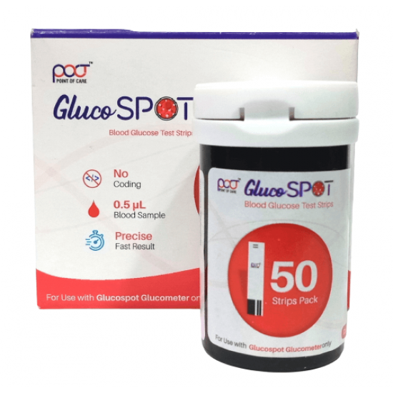 Free Shipping on orders above ₹599 Product Description :POCT Gluco Spot Blood Glucose Test Strips 50's Pack are used only with gluco spot glucometer or gluco spot blood glucose monitoring system. POCT (Point Of Care) gluco spot test strips are mainly used to measure glucose in capillary whole blood outside of the body (In Vitro Diagnostic Use). Glucospot test strips are plasma calibrated to allow easy comparison of results with laboratory methods.Gluco spot blood glucose test strips (50's pack) are suitable for self-monitoring and management of blood glucose. People with diabetes can use gluco spot glucose strips along with the system to self-test their blood glucose. Healthcare professionals can also use these strips to check patients' blood glucose values and they can use it in suspected cases of diabetes and in emergency diagnostics. These no coding test strips facilitates simple usage as it does not need any type of manual coding. Gluco spot meter requires 0.5 μl (micro litre) of blood sample on a gluco spot test strip for determining the blood glucose level. Test completes in approx 5 seconds thus provides precise and fast results.Test Principle : When blood is added to the gluco spot strip, the chemicals within the strip react to create a tiny electrical current. Your meter reads the current & displays your level of blood glucose.Gluco spot strips are also available in packs of 25 and 100 strips.ABOUT POCT (POINT OF CARE) :POCT (Point of Care Biomedical Pvt Ltd), Ahmedabad, Gujarat (India) is an ideal example of Quality, Reliability, Integrity & Innovation.POCT is the sister concern of PROACTIVE HEALTH INC, since inception in year 2007 the PROACTIVE HEALTH INC has accumulated a spectacular 12 years of experience. Unravelling from its modest and humble beginnings to a full-fledged complete medical device supply and manufacturing company, it now prides itself as a holistic incorporation of Sales & Distribution of Medical & Healthcare devices supplies. |