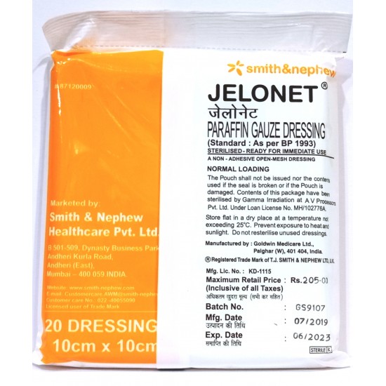 JELONET is a paraffin gauze dressing which is marketed by Smith & Nephew Healthcare Pvt. Ltd. JELONET paraffin gauze dressing is also sterilised - ready for immediate use. It is a non-adhesive open-mesh dressing. Soft paraffin base, Sterile leno weave presentation & Comprehensive size range are the main features of JELONET paraffin gauze dressing.
