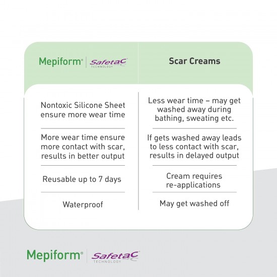 • The mepiform silicone bandage or silicone tape is comfortable, conformable (conforms well to body contours) and easy to use
