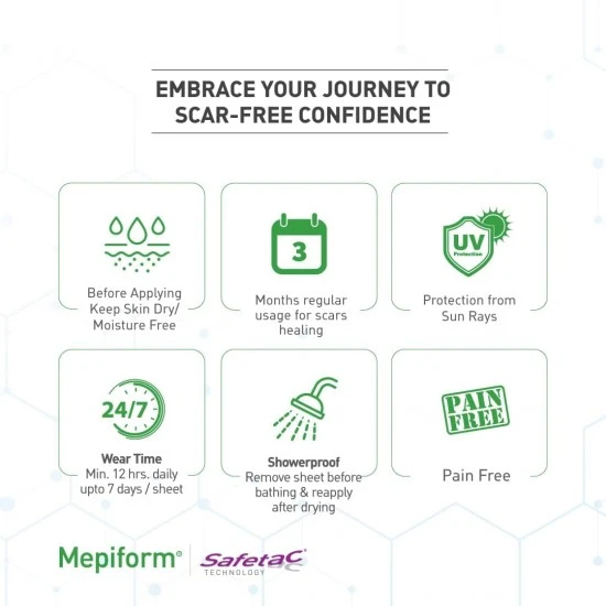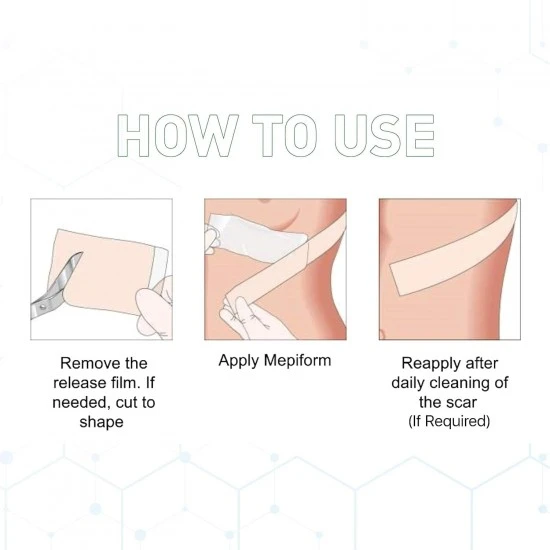 Topical silicone empirically has been shown to have a positive effect on hypertrophic and keloid scars. Mepiform should optimally be worn 24 hours a day. It is suggested that Mepiform is removed once a day (e.g., at time of showering or bathing) for inspection and washing of the skin. It may take from 3 to 12 months or longer to improve an old scar, depending on the condition of the scar tissue. For prophylactic treatment, Mepiform should be used for 2 to 6 months depending on the condition of the scar.