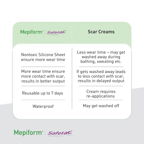 • Can Be Re-Applied: Mepiform silicone gel sheet may be lifted, adjusted, and left in place for several days