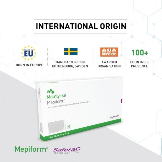 Mepiform Non Sterile (10cm x 18cm) by Molnlycke is a self-adherent soft silicone dressing specially designed for care and management of both old & new scars.