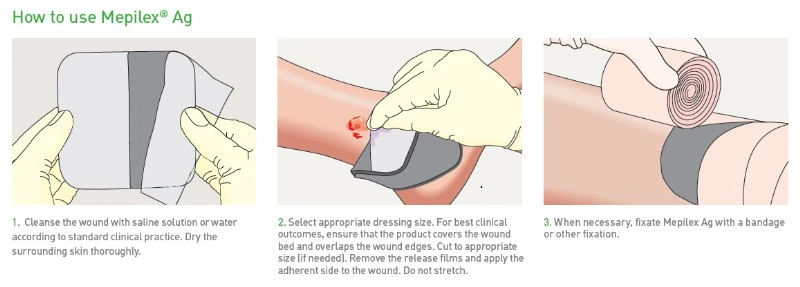 Free Shipping on orders above ₹599 Product Description : Mepilex Ag (10cm x 10cm) by Molnlycke is an antimicrobial soft silicone foam dressing.Mepilex Ag Dressing consists of a Safetac® wound contact layer, a flexible absorbent pad of grey polyurethane foam containing silver sulphate and coloured by activated carbon and a breathable and water proof film.Safetac® is a proprietary adhesive technology developed by Mölnlycke that minimises pain to patients and trauma to intact skin or wounds.Mepilex Ag is a highly conformable dressing that absorbs exudate, maintains a moist wound healing environment and has antimicrobial properties.Mepilex Ag contains silver sulphate (1.2 mg Ag/cm2) to create an effective bacterial barrier and inactivate a wide range of wound related pathogens (bacteria and fungi), as shown in vitro. By reducing the number of micro-organisms, Mepilex Ag may also reduce odour.Mepilex Ag silver foam dressing has also been shown to inactivate wound related pathogens up to 7 days in vitro.Indications for use :Mepilex Ag antimicrobial soft silicone foam dressing is designed for the management of low to medium exuding leg and foot ulcers, pressure ulcers, and partial thickness burns.Mepilex Ag may be used on infected wounds as part of a treatment regimen under supervision of a qualified health care professional.Mepilex Ag can be used under compression bandaging.Instructions for use :Mepilex Ag Dressing should be used by or under the supervision of a qualified health care professional. |