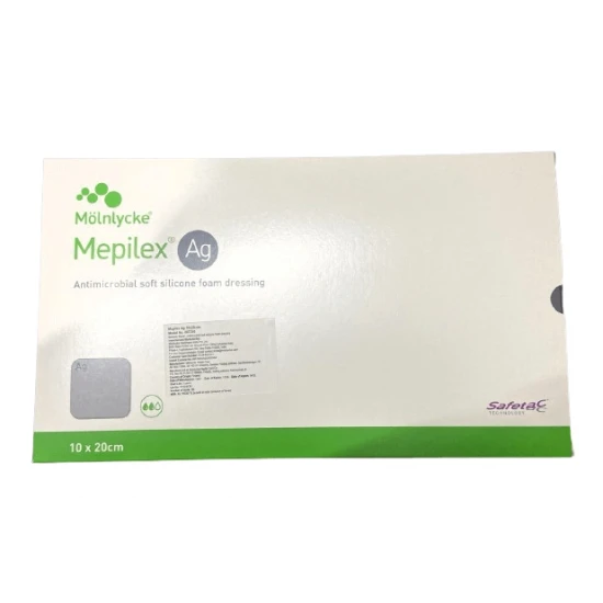 Free Shipping on orders above ₹599 Product Description : Mepilex Ag (10cm x 20cm) by Molnlycke is an antimicrobial soft silicone foam dressing.Mepilex Ag Dressing consists of a Safetac® wound contact layer, a flexible absorbent pad of grey polyurethane foam containing silver sulphate and coloured by activated carbon and a breathable and water proof film.Safetac® is a proprietary adhesive technology developed by Mölnlycke that minimises pain to patients and trauma to intact skin or wounds.Mepilex Ag is a highly conformable dressing that absorbs exudate, maintains a moist wound healing environment and has antimicrobial properties.Mepilex Ag contains silver sulphate (1.2 mg Ag/cm2) to create an effective bacterial barrier and inactivate a wide range of wound related pathogens (bacteria and fungi), as shown in vitro. By reducing the number of micro-organisms, Mepilex Ag may also reduce odour.Mepilex Ag silver foam dressing has also been shown to inactivate wound related pathogens up to 7 days in vitro.Indications for use :Mepilex Ag antimicrobial soft silicone foam dressing is designed for the management of low to medium exuding leg and foot ulcers, pressure ulcers, and partial thickness burns.Mepilex Ag may be used on infected wounds as part of a treatment regimen under supervision of a qualified health care professional.Mepilex Ag can be used under compression bandaging.Instructions for use :Mepilex Ag Dressing should be used by or under the supervision of a qualified health care professional. |
