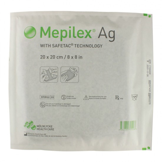 Product Description : Mepilex Ag (20cm x 20cm) by Molnlycke is an antimicrobial soft silicone foam dressing.Mepilex Ag Dressing consists of a Safetac® wound contact layer, a flexible absorbent pad of grey polyurethane foam containing silver sulphate and coloured by activated carbon and a breathable and water proof film.Safetac® is a proprietary adhesive technology developed by Mölnlycke that minimises pain to patients and trauma to intact skin or wounds.Mepilex Ag is a highly conformable dressing that absorbs exudate, maintains a moist wound healing environment and has antimicrobial properties.Mepilex Ag (20x20cm) contains silver sulphate (1.2 mg Ag/cm2) to create an effective bacterial barrier and inactivate a wide range of wound related pathogens (bacteria and fungi), as shown in vitro. By reducing the number of micro-organisms, Mepilex Ag may also reduce odour.Mepilex Ag silver foam dressing has also been shown to inactivate wound related pathogens up to 7 days in vitro.Indications for use :Mepilex Ag antimicrobial soft silicone foam dressing is designed for the management of low to medium exuding leg and foot ulcers, pressure ulcers, and partial thickness burns.Mepilex Ag may be used on infected wounds as part of a treatment regimen under supervision of a qualified health care professional.Mepilex Ag can be used under compression bandaging.Instructions for use :Mepilex Ag Dressing should be used by or under the supervision of a qualified health care professional.Note that local hygiene procedures should be followed prior to and following the dressing change.