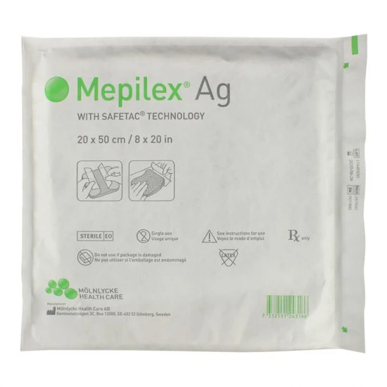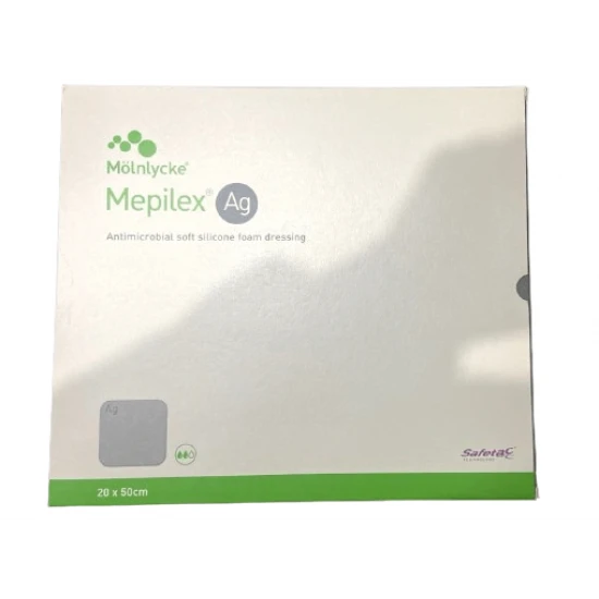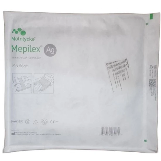 Free Shipping on orders above ₹599 Product Description : Mepilex Ag (20cm x 50cm) by Molnlycke is an antimicrobial soft silicone foam dressing.Mepilex Ag Dressing (20x50cm) consists of a Safetac® wound contact layer, a flexible absorbent pad of grey polyurethane foam containing silver sulphate and coloured by activated carbon and a breathable and water proof film.Safetac® is a proprietary adhesive technology developed by Mölnlycke that minimises pain to patients and trauma to intact skin or wounds.Mepilex Ag is a highly conformable dressing that absorbs exudate, maintains a moist wound healing environment and has antimicrobial properties.Mepilex Ag contains silver sulphate (1.2 mg Ag/cm2) to create an effective bacterial barrier and inactivate a wide range of wound related pathogens (bacteria and fungi), as shown in vitro. By reducing the number of micro-organisms, Mepilex Ag may also reduce odour.Mepilex Ag silver foam dressing has also been shown to inactivate wound related pathogens up to 7 days in vitro.Indications for use :Mepilex Ag antimicrobial soft silicone foam dressing is designed for the management of low to medium exuding leg and foot ulcers, pressure ulcers, and partial thickness burns.Mepilex Ag may be used on infected wounds as part of a treatment regimen under supervision of a qualified health care professional.Mepilex Ag can be used under compression bandaging.Instructions for use :Mepilex Ag Dressing should be used by or under the supervision of a qualified health care professional. |
