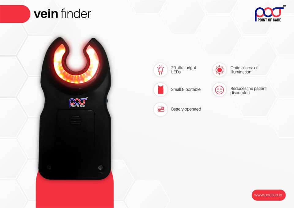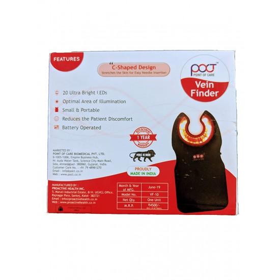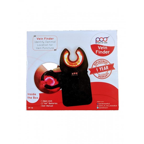 Product Description : POCT (Point of Care) vein finder is a small and portable medical device which assists you identifying optimal location for vein puncture. POCT Vein Finder helps clinicians to locate and access the vein. This vein finder from point of care biomedical pvt. ltd. specially comes in C-shaped design thus stretches the skin for easy needle insertion. This vein finder has 20 ultra bright LEDs (10 yellow and 10 red LEDs) Weight of this vein finder device including battery is 3 oz (approx.). This device features optimal area of illumination which avoids multiple needle prick and no treatment delay thus also reduces the patient discomfort.Features & Specifications :