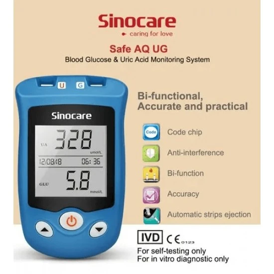 Free Shipping on orders above ₹599 Product Description :Sinocare Safe AQ UG Blood Glucose and Uric Acid Meter is for your daily health monitoring. You can use Safe AQ UG to conveniently and quickly detect your uric acid level and blood glucose level anytime, anywhere.Accurate and straightforward Testing: It helps you get exact and fast results in an easy way. A new modern design with high-contrast LCD display is for easier and more discrete use.Advanced Electrode Strips: It can avoid interference from blood oxygen variations and give you the assurance of accurate test results each time.Small and Easy to Use: You can use this device with one-handed priming. Fast lancing, personalized adjustable penetration depth settings are employed. A virtually pain-free lancing design can effectively helps minimize skin damage.GU Two Function Test System: Double-slot design, get blood glucose and uric acid result via ONE machine.How To Use:Before using this product, please read instruction manual carefully.Features & Specifications :